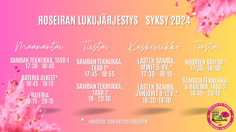 Syyskausi alkaa 12.8.2024 Julkaistu 1 elokuun, 2024 kirjoittanut lissuroseira Roseiran syyskauden 2024 lukujärjestys on nyt julkaistu! Uuden lukujärjestyksen ja päivitetyt tuntikuvaukset löydät täältä ja kauden 2024–2025 hinnaston täältä. Syyskausi alkaa Roseiralla 12.8.2024, nähdään tunneilla! Jaa tämä: Jaa X:ssä(Avautuu uudessa ikkunassa) X Jaa Facebookissa(Avautuu uudessa ikkunassa) Facebook Tykkää Lataa... Aiheeseen liittyy