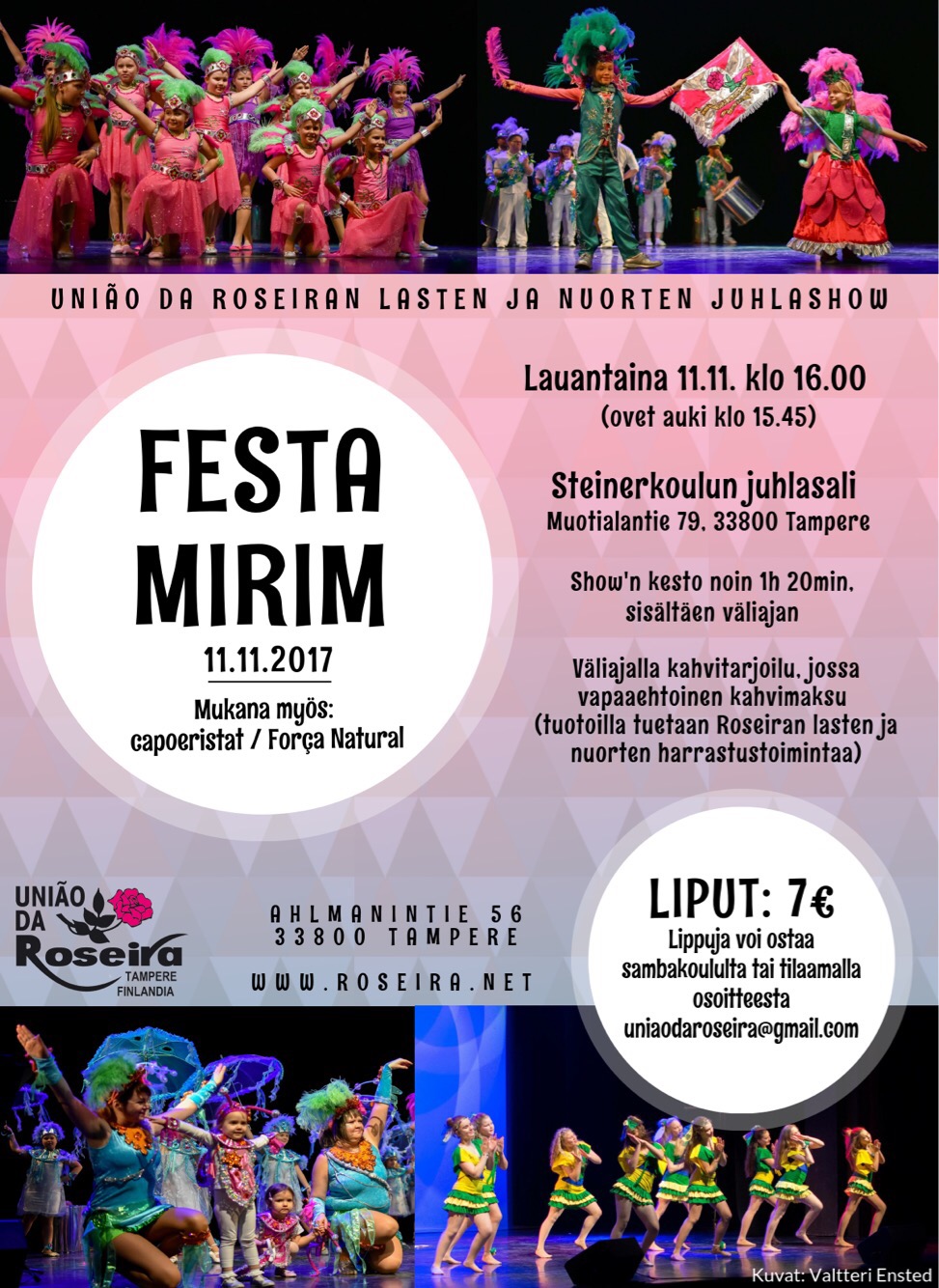 Ensi viikolla pääsee riemukkaisiin sambatunnelmiin, kun Roseiran lapset ja nuoret esiintyvät omassa juhlavuoden show’ssaan. Festa Mimim järjestetään Steinerkoulun juhlasalissa lauantaina 11.11. klo 16 alkaen (ovet aukeavat klo 15.45). Lipun hinta on 7 euroa. Lipputilaukset osoitteeseen uniaodaroseira@gmail.com. Tervetuloa!